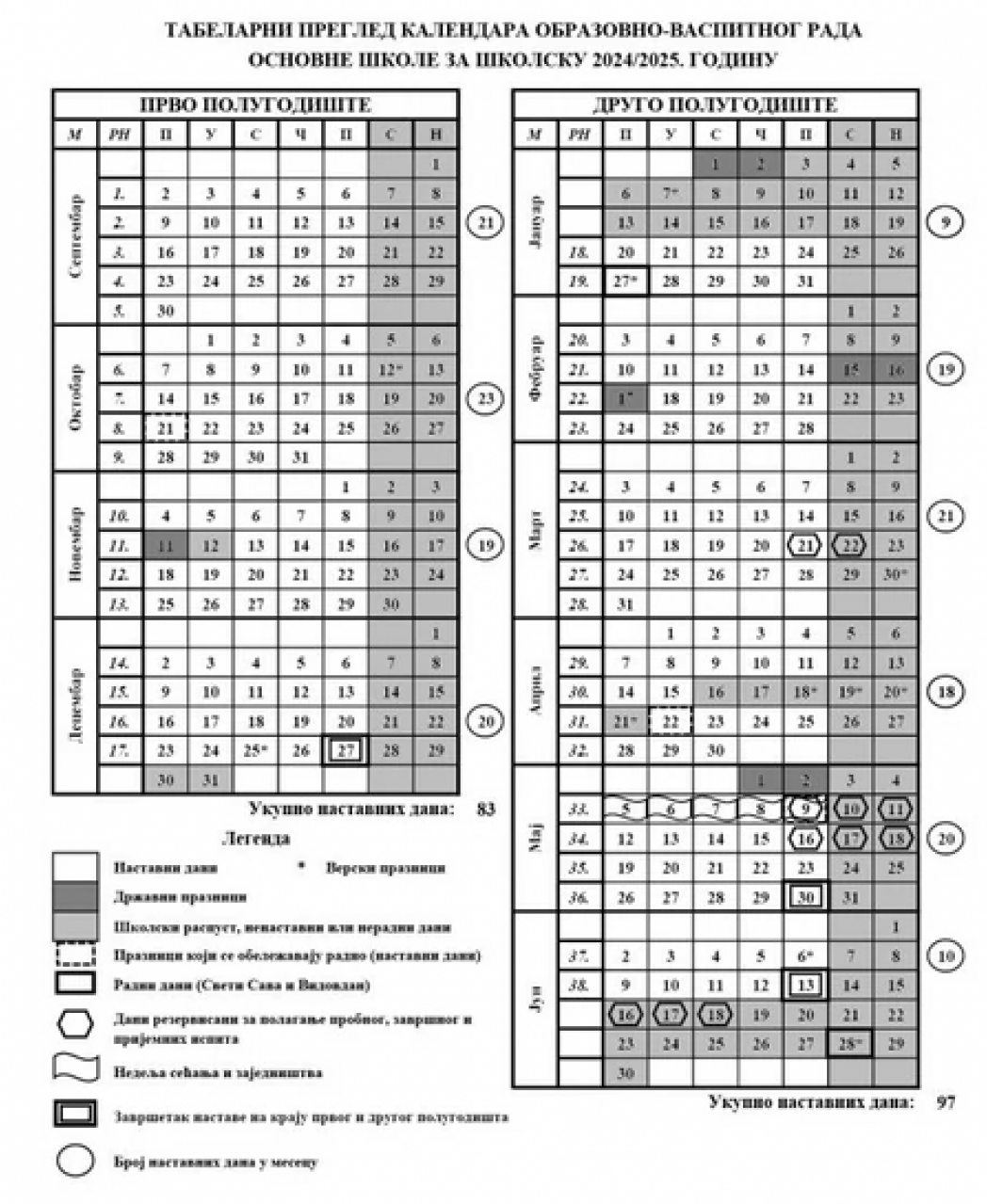 - Zimski raspust: 30. decembar 2024. godine - 17. januar 2025. godine (plus vikend pre i posle).