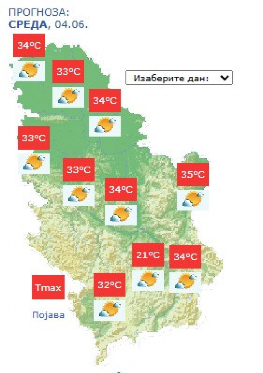 U Srbiji će danas biti pretežno sunčano i veoma toplo vreme. Temperature će se kretati od 13 do 35 stepeni, koliko će maksimalno biti i u Beogradu. Prvi letnji toplotni talas ove godine pogodio je Srbiju, a prema najavama meteorologa, kraj vrućinama je na vidiku!