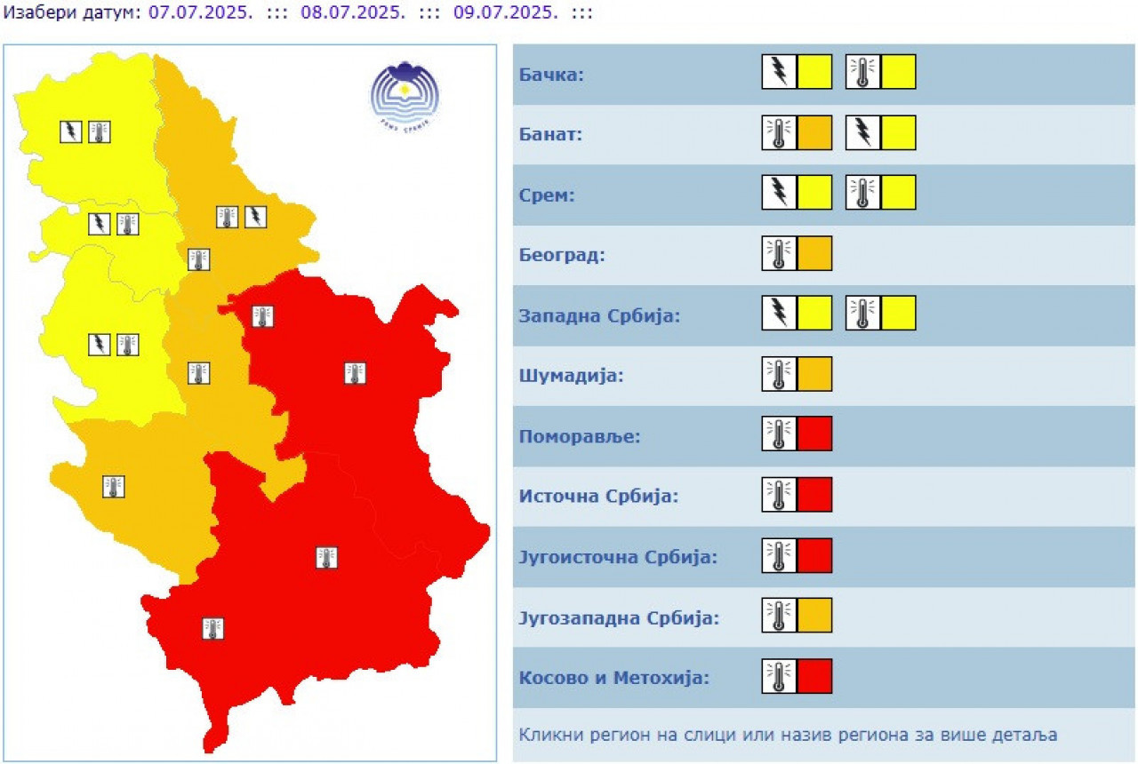 Crveni meteoalarm, koji označava vrlo opasno vreme, na snazi je u Pomoravlju, istočnoj i jugoistočnoj Srbiji i na Kosovu i Metohiji.