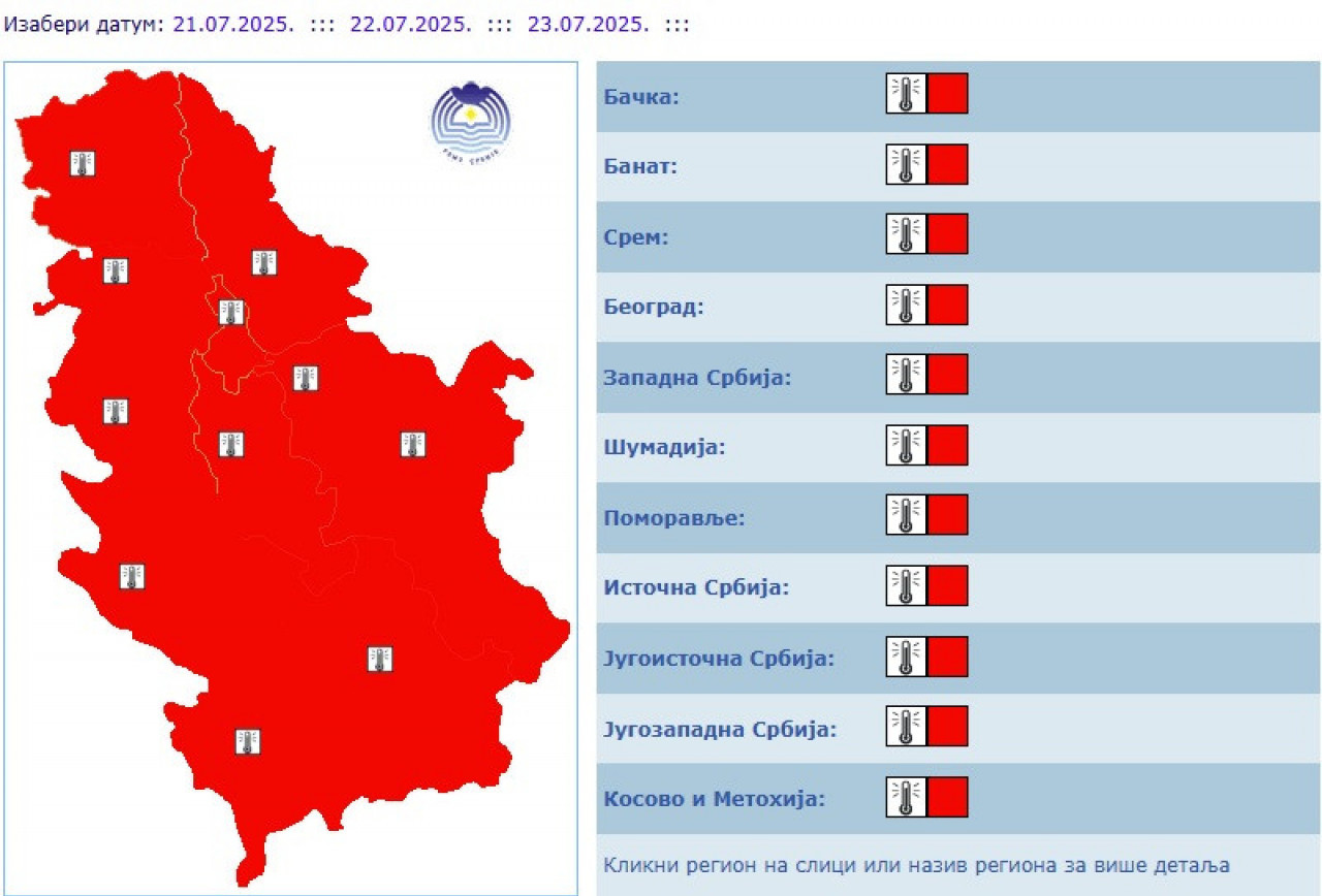 U regionima u kojima se očekuje udruženi efekat izraženog toplotnog talasa, odnosno pet dana uzastopno sa maksimalnom temperaturom od 38 stepeni i više, i dugotrajne suše, građanima su poslata i SMS upozorenja - u Topličkom, Jablaničkom, Pčinjskom, Pirotskom, Nišavskom i Zaječarskom okrugu.