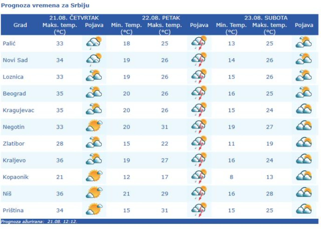 "Plјuskovi i grmlјavine koji se na području Srbije očekuju u petak lokalno će biti praćeni gradom i jakim ili olujnim vetrom. Najveća verovatnoća pojave grada je u oblasti od zapadne i jugozapadne Srbije preko Šumadije i Pomoravlјa dalјe na istok zemlјe, dok će uslova za kratkotrajno jak ili olujni vetar biti i severnije i južnije od ove oblasti. Za konkretne lokacije izdavaće se hitna upozorenja jedan do dva časa unapred", upozorio je RHMZ.