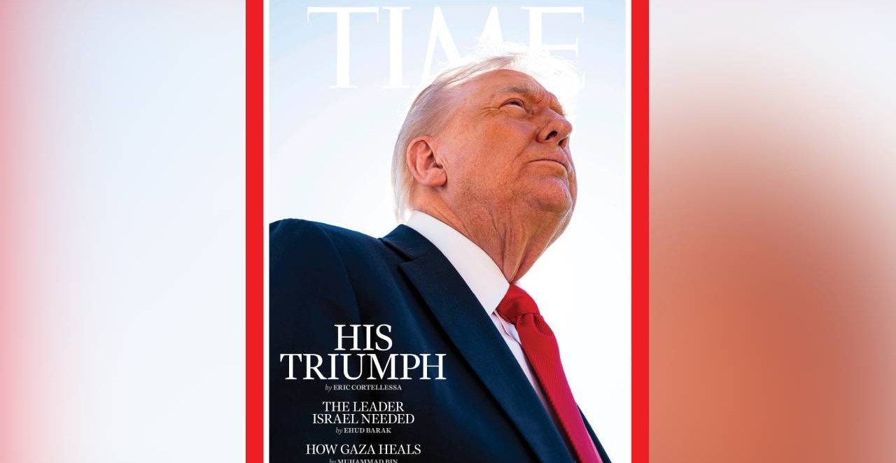 Naslovna strana Tajma, objavljena u ponedeljak sa naslovom "Njegov trijumf", prikazuje Trampa odozdo kako gleda gore, delimično osvetljen jakim svetlom.