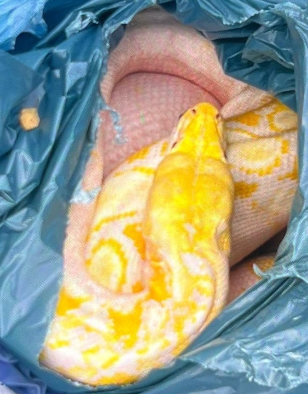 Žuti mrežasti piton ležao je u kesi za smeće među starim farmerkama i džemperima. Uznemiren, svedok je pozvao policiju u pomoć - nije bilo jasno da li je životinja još uvek živa i potencijalno opasna.