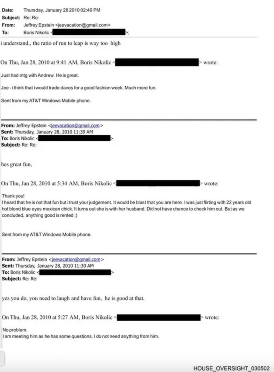 Razmena poruka između Džefrija Epstina i Borisa Nikolića, bivšeg savetnika Bila Gejtsa, dogodila se u januaru 2010. godine, šest meseci nakon što je Epstein pušten iz zatvora na Floridi, gde je služio kaznu zbog dovođenja maloletnice u prostituciju. Princ Endrju je u to vreme bio posebni predstavnik Velike Britanije za međunarodnu trgovinu i investicije.