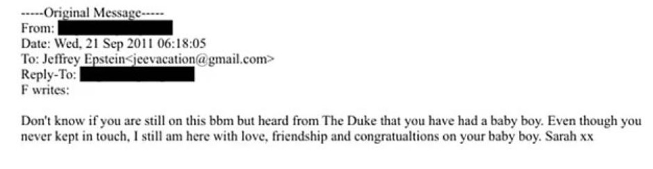 U poruci iz septembra 2011. godine, samo mesec dana nakon što je Epstajn izašao iz zatvora zbog podvođenja maloletnica, Fergusonova mu šalje "ljubav, prijateljstvo i čestitke" povodom rođenja sina. Ovo saznanje otvara Pandorinu kutiju pitanja o Epstajnovom skrivenom životu, njegovim vezama sa kraljevskom porodicom i mračnom nasleđu.