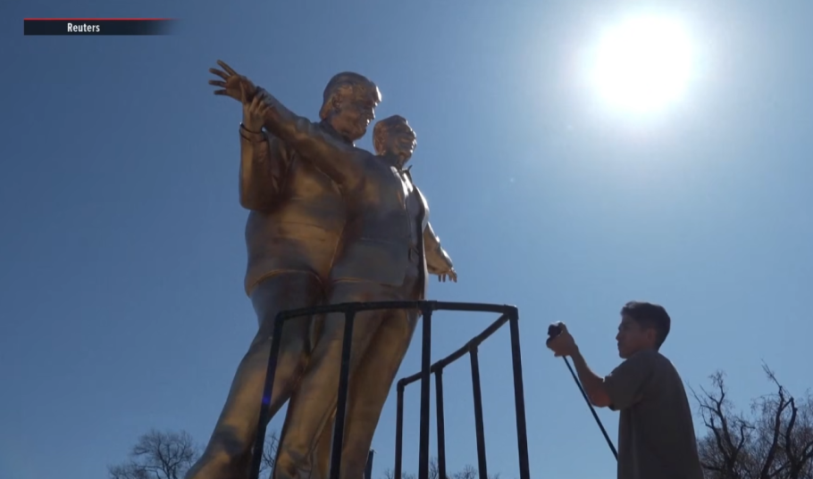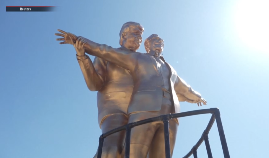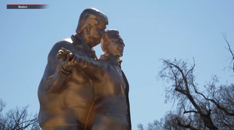 Skulptura prikazuje predsednika Trampa kako grli preminulog osuđenog seksualnog prestupnika Džefrija Epstina, u rekonstrukciji čuvene scene iz filma "Titanik".