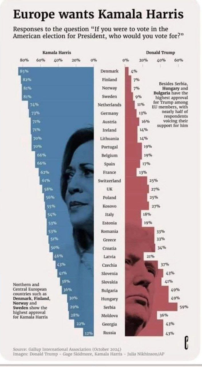 Kao što je to bio slučaj poslednjih godina, većina zapadne, a posebno severne Evrope, glasala bi za kandidatkinju demokrata Kamalu Haris. Na drugom kraju lestvice su Srbija, Mađarska, Bugarska, ali i Rusija i Gruzija koje bi glasale za Donalda Trampa ako bi im se pružila šansa.