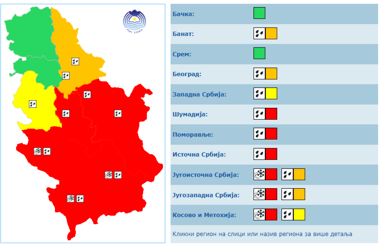 Nakon kišnog i snežnog četvrtka, u brdsko–planinskim predelima jugozapadne, južne, jugoistočne i istočne Srbije očekuje se formiranje snežnog pokrivača od 10 do 20 centimetara, lokalno i preko 50 centimetara za period od 48 sati.