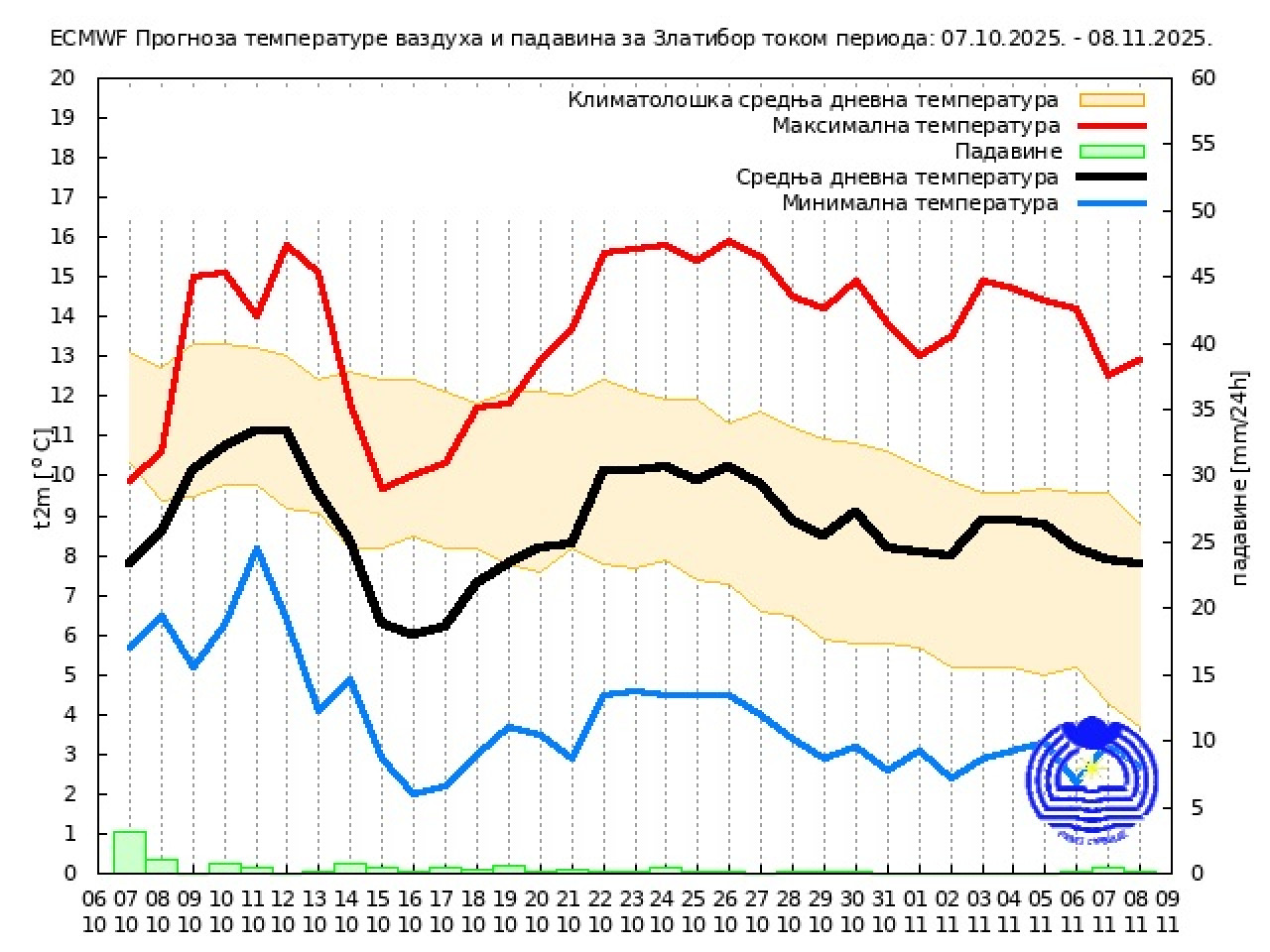 Na Kopaoniku će biti znatno hladnije — najniže temperature pašće i do –5 stepeni. Najviša dnevna temperatura biće 12. oktobra, kada se očekuje 8 stepeni, a već 15. oktobra maksimalna dnevna neće prelaziti 2 stepena. Tih dana prognoziraju se i obilnije padavine.