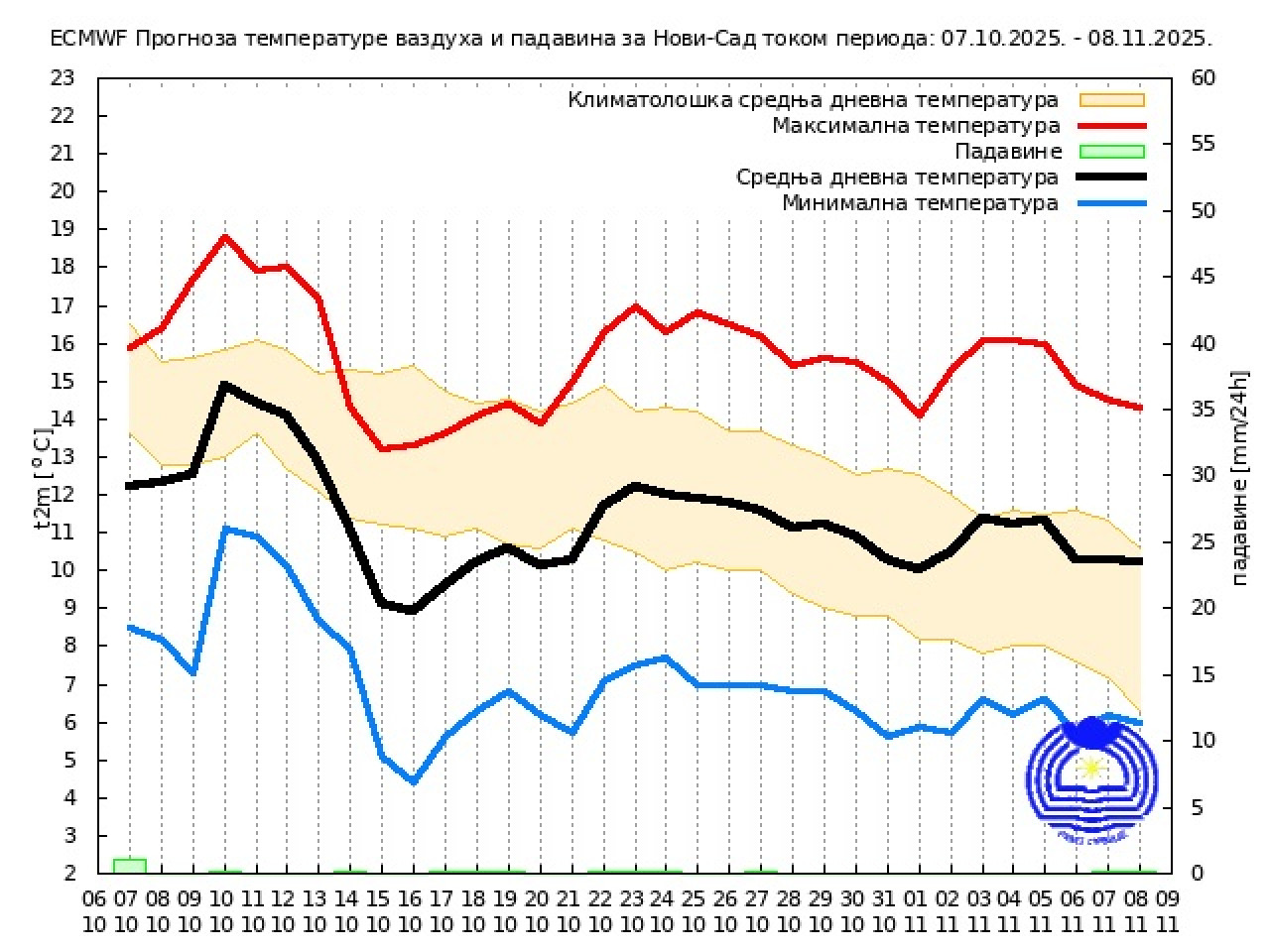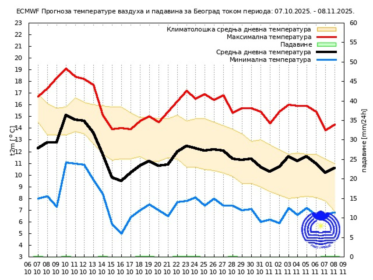 U Beogradu se najhladniji dan očekuje 16. oktobra, sa minimalnom temperaturom od 5 i maksimalnom od 14 stepeni, dok će najtopliji dan biti 23. oktobar, kada će živa dostići 18 stepeni.