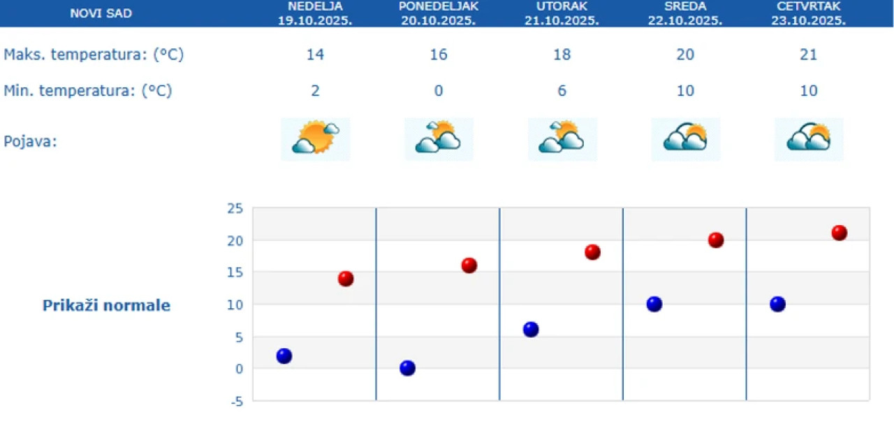 Pogledajte petodnevnu vremensku prognozu u većim gradovima Srbije: