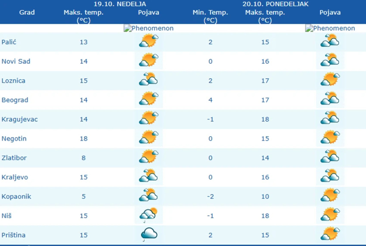 U ponedeljak, najviše izmerene temperature biće izmerene u Kragujevcu i Nišu sa maksimalnih 18 stepeni Celzijusa. Minimalne temperature od -2 biće izmerene na Paliću, Zlatiboru i u Prištini.