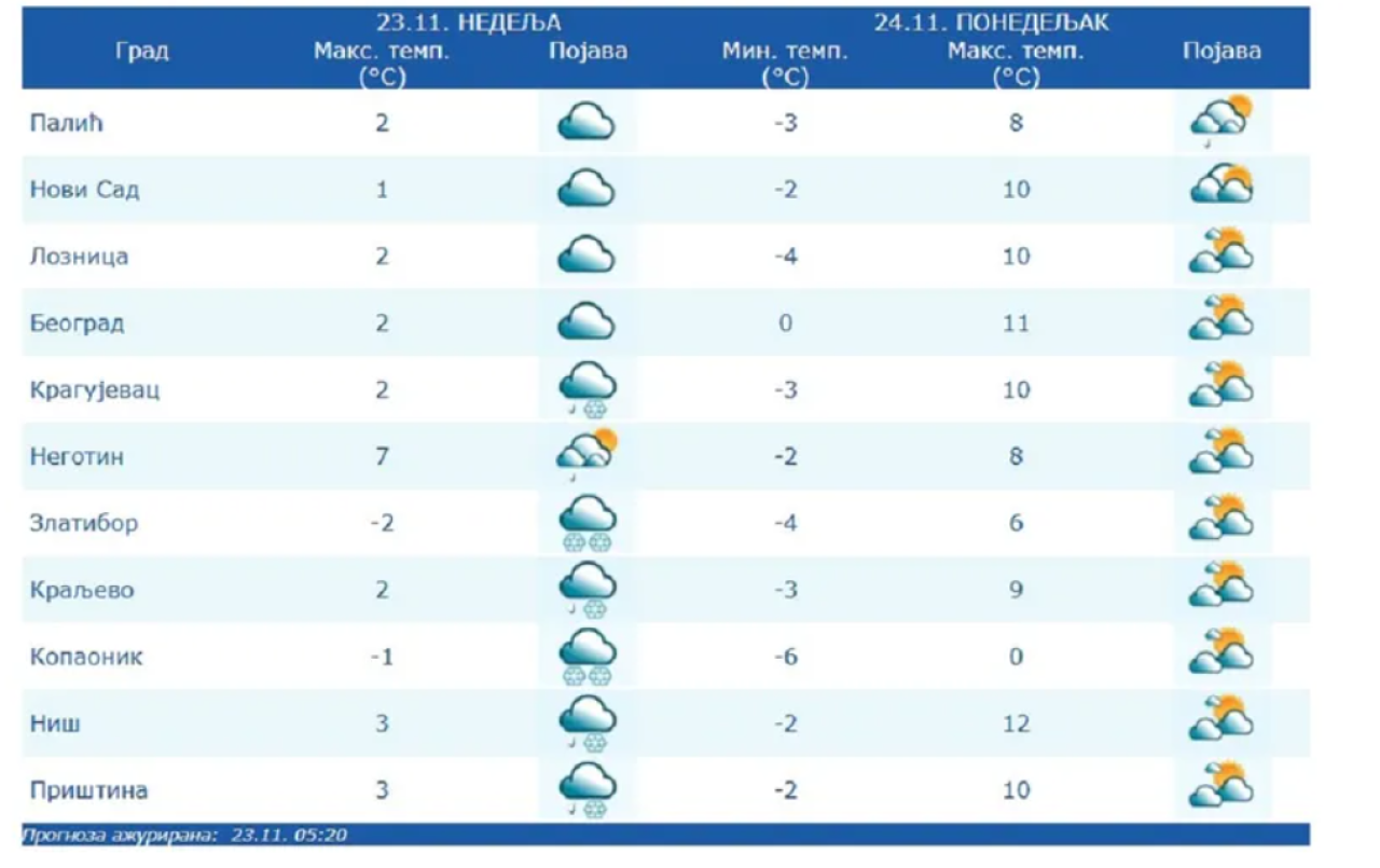 Današnji dan donosi oblačno i hladno vreme. Na severu i zapadu zemlje biće suvo, dok se u ostalim krajevima očekuju padavine – mestimično kiša, susnežica i sneg, naročito u brdsko-planinskim predelima gde se očekuje manje povećanje visine snega.
