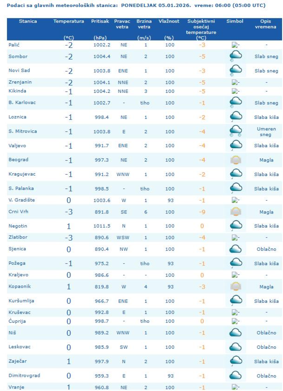 Jutarnja temperatura kretaće se od minus tri do četiri, a najviša dnevna u većini krajeva od minus jedan do tri, na krajnjem jugu i jugoistoku toplije od sedam do 12 stepeni.
