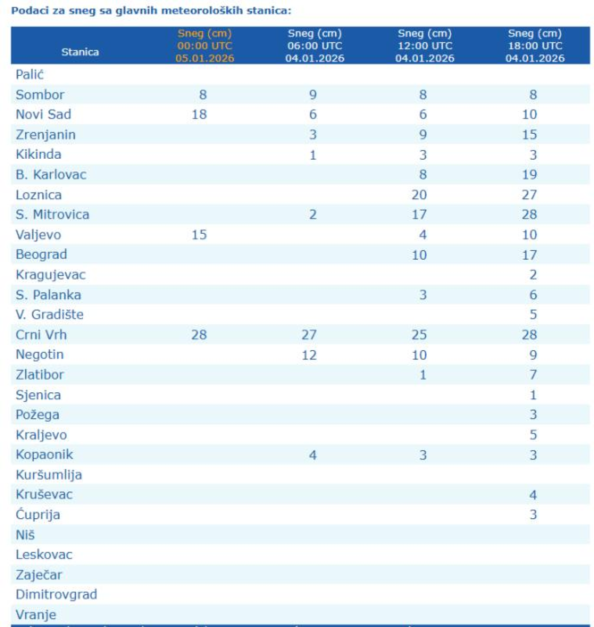 Do četvrtka (05-08.01.) oblačno i u većem delu hladno, naročito na severu i zapadu Srbije gde se očekuju ledeni dani, kada temperatura neće preći 0 °S i u ovim oblastima padaće uglavnom sneg uz dalјe povećanje visine snežnog pokrivača, u ostalim krajevima padaće sneg i kiša koja će se lediti na tlu i to naročito u centralnom pojasu zemlјe (od juga Bačke, Srema, zapadne i jugozapadne Srbije, preko Beograda, južnog Banata, Šumadije, Pomoravlјa i Homolјa, dalјe ka istoku - Timočkoj i Negotinskoj Krajini), dok će na jugu i jugoistoku i dalјe biti toplije sa kišom.