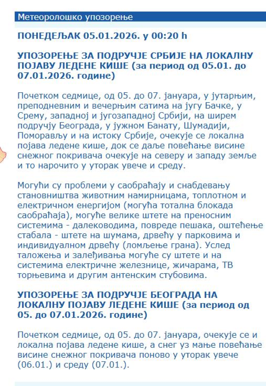 Početkom sedmice, od 05. do 07. januara, u jutarnjim, prepodnevnim i večernjim satima na jugu Bačke, u Sremu, zapadnoj i jugozapadnoj Srbiji, na širem području Beograda, u južnom Banatu, Šumadiji, Pomoravlјu i na istoku Srbije, očekuje se lokalna pojava ledene kiše, dok se dalјe povećanje visine snežnog pokrivača očekuje na severu i zapadu zemlјe i to naročito u utorak uveče i sredu.
