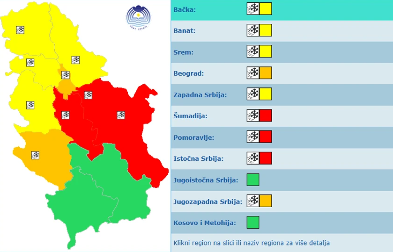 - Danas (06.01.) i sutra (07.01.), u jutarnjim, prepodnevnim i večernjim satima na jugu Bačke, u Sremu, zapadnoj Srbiji, na širem području Beograda, u južnom Banatu, Šumadiji, Pomoravlјu i na istoku Srbije, očekuje se lokalna pojava ledene kiše, dok se dalјe značajnije povećanje visine snežnog pokrivača očekuje u toku noći ka sredi i u sredu (07.01.) na severu i zapadu zemlјe - upozoravaju iz RHMZ, i dodaju: