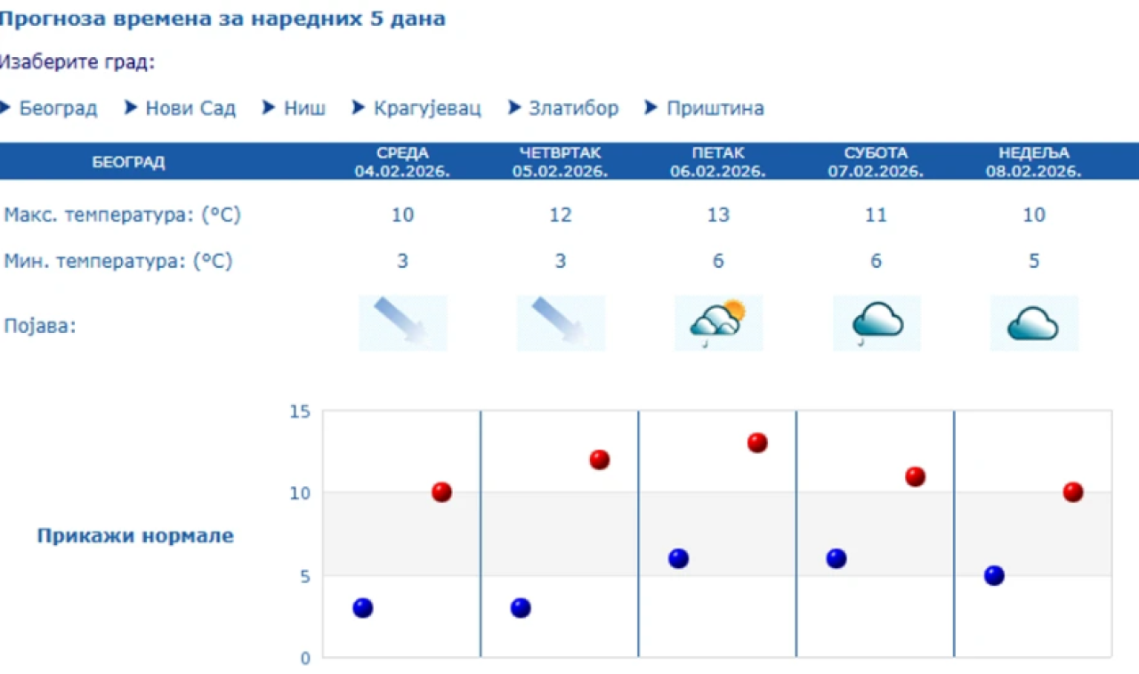- Najviša temperatura od 4 do 10 stepeni Celzijusa, na severu Vojvodine oko 2 stepena Celzijusa, a na istoku zemlјe osetno hladnije, oko -4 stepena Celzijusa. Uveče i tokom noći novo naoblačenje sa zapada, koje će prvo na severu i zapadu, a zatim i u centralnim predelima Srbije, usloviti kišu i plјuskove - objavljeno je na sajtu RHMZ.