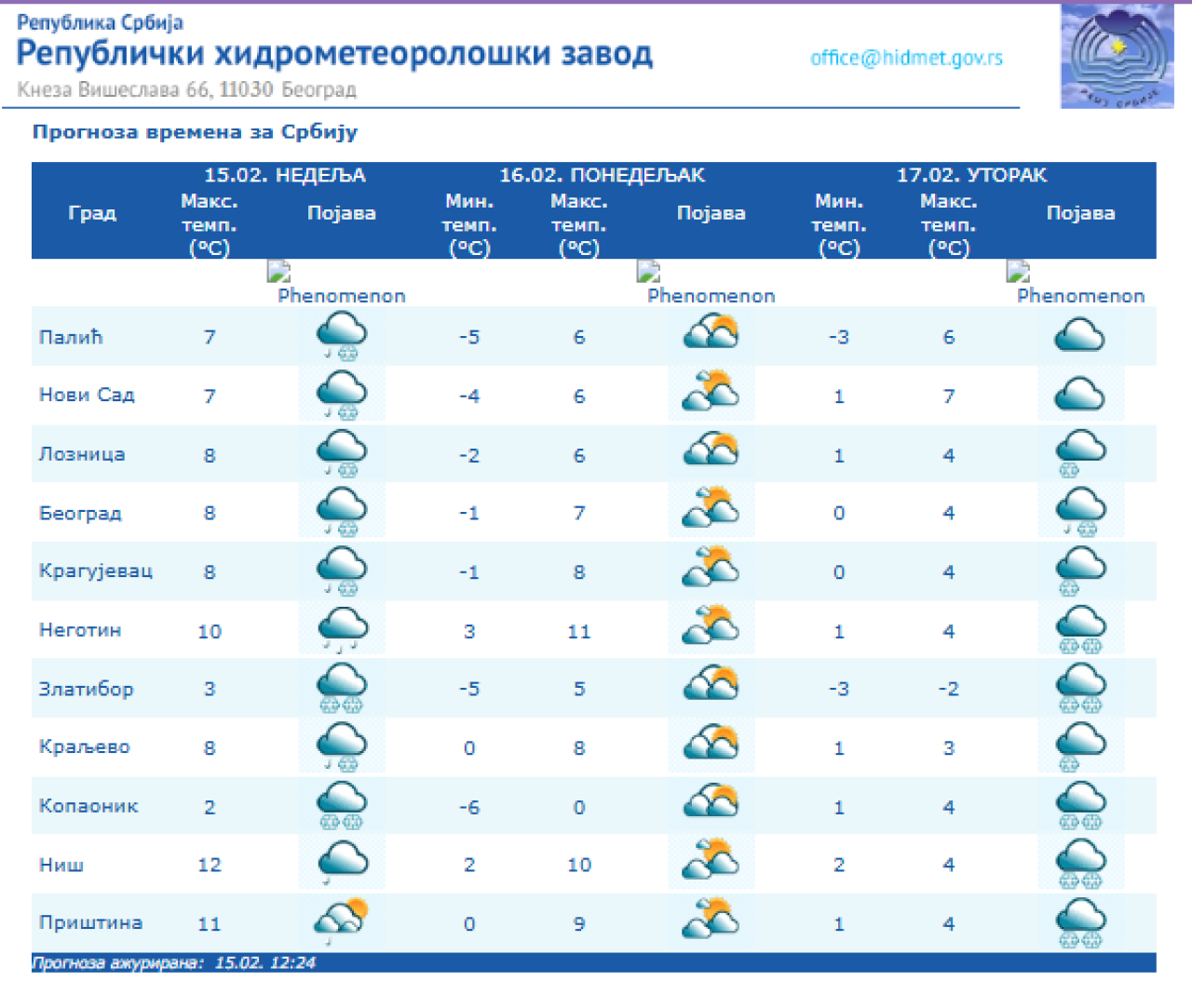 - U naredna dva sata na području Beograda očekuje se sneg umerenog intenziteta, dok će kasnije tokom večeri padavine postepeno prestati. Na krajnjem severu zemlje biće suvo uz smanjenje oblačnosti, dok u ostalim krajevima preovladava oblačno vreme sa kišom i snegom. Poseban oprez savetuje se u brdsko-planinskim predelima zapadne i jugozapadne Srbije, gde se lokalno očekuje formiranje novog snežnog pokrivača visine do 10 centimetara. Pored padavina, situaciju dodatno otežava jak i olujni severozapadni vetar. - stoji u saopštenju RHMZ.